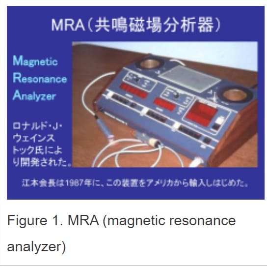 In this method, a device called an MRA (Magnetic Resonance Analyzer: the literal translation in Japanese is 'resonance magnetic field analyser') (Fig. 1) is used to measure the energetic state of the client's body and resolve energetic defects one by one (Fig. 2).