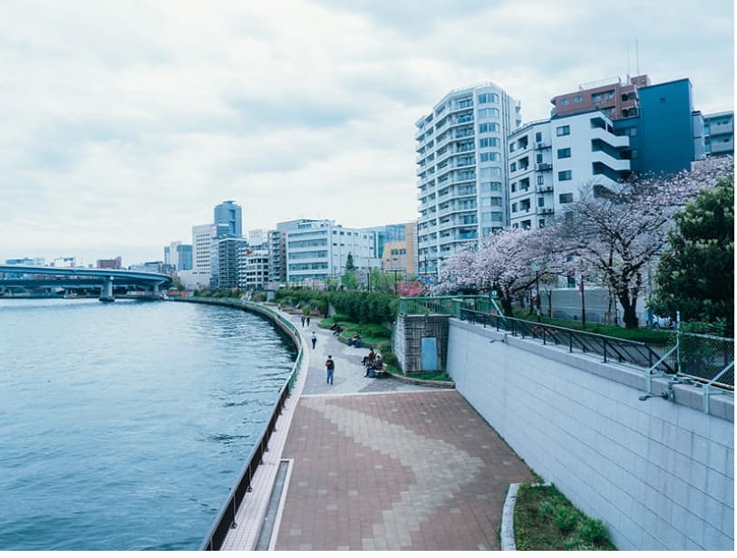 As you stroll along the riverside promenade, surrounded by water and greenery, you can admire impressive bridges such as the Umayabashi, Komagatabashi and Azumabashi bridges, as well as charming houseboats. Other highlights include the impressive Tokyo Skytree and the 'Flame Object' on top of the Asahi Group Hall building.